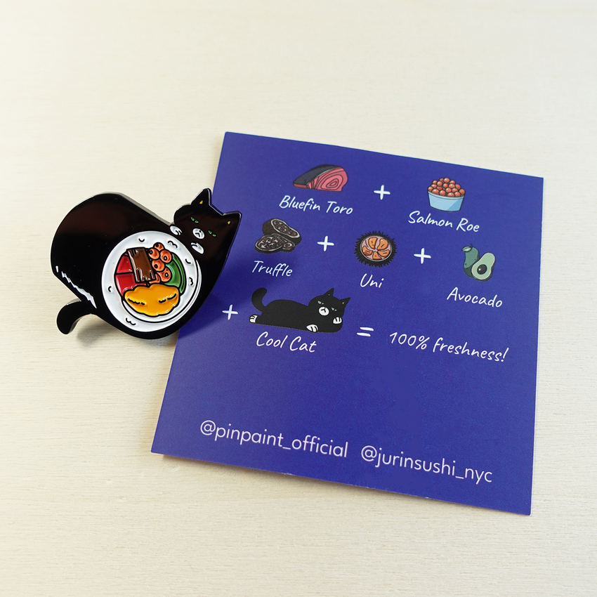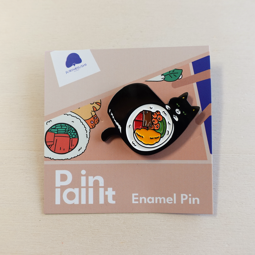 This playful enamel pin features Cool Cat wrapped around and playing with a delicious sushi roll. A delightful collaboration with Jurin Sushi, it’s the perfect blend of feline charm and sushi vibes—a must-have for cat lovers and sushi fans alike!