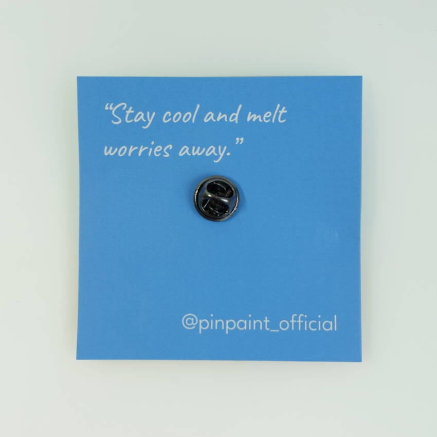 "Stay cool and melt worries away." This pin features a serene table design, complete with a lamp and a refreshing drink, evoking a sense of calm and relaxation. It’s a perfect way to bring a touch of tranquility to your collection or to gift to someone who appreciates peaceful moments.