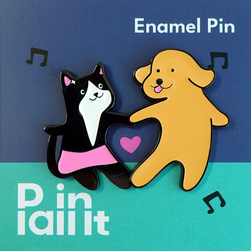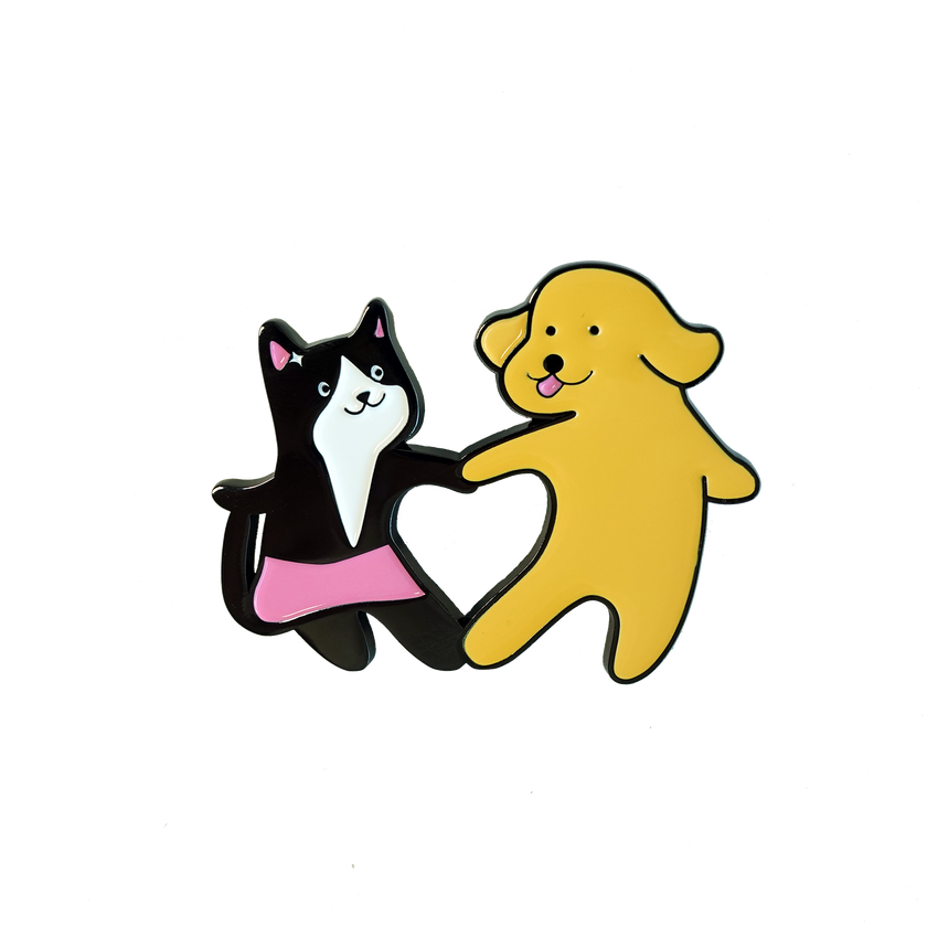"Step by step, paw by paw." This playful pin showcases a joyful cat and dog dancing hand in paw, celebrating love and happiness. Whether you're a pet lover or just enjoy whimsical designs, this pin is a delightful reminder that the simple moments, when shared, become magical! A heartwarming gift to brighten up any outfit or collection.