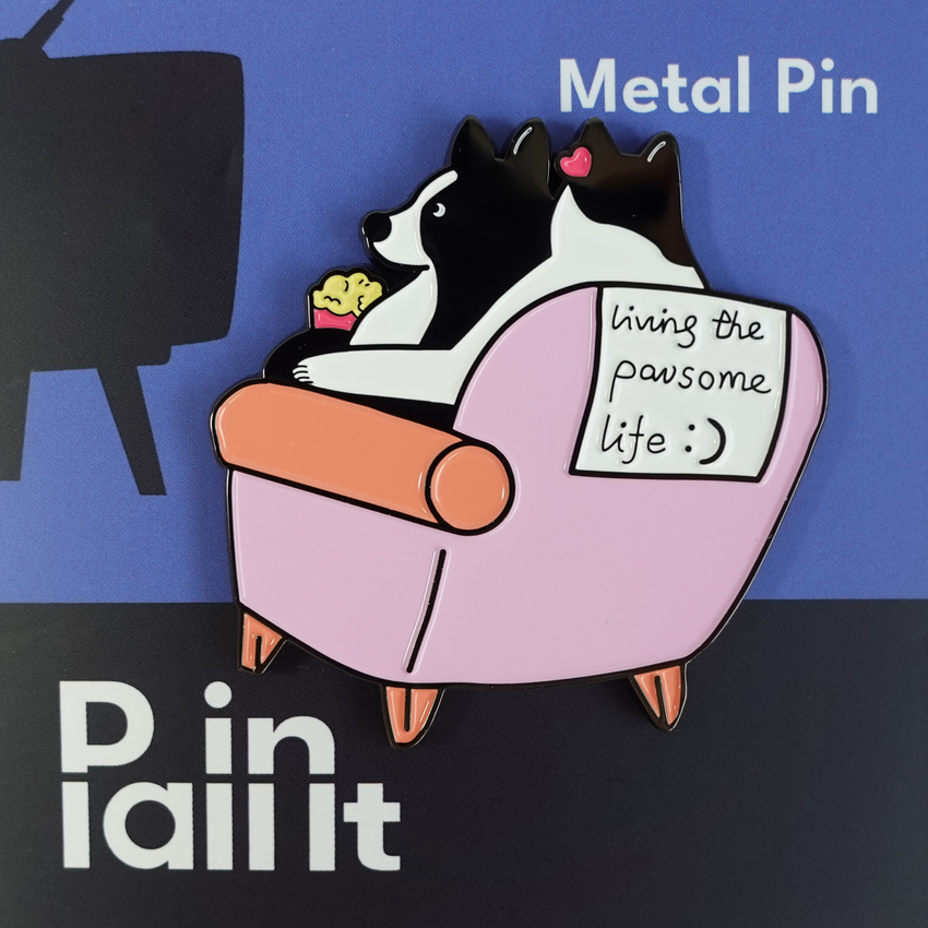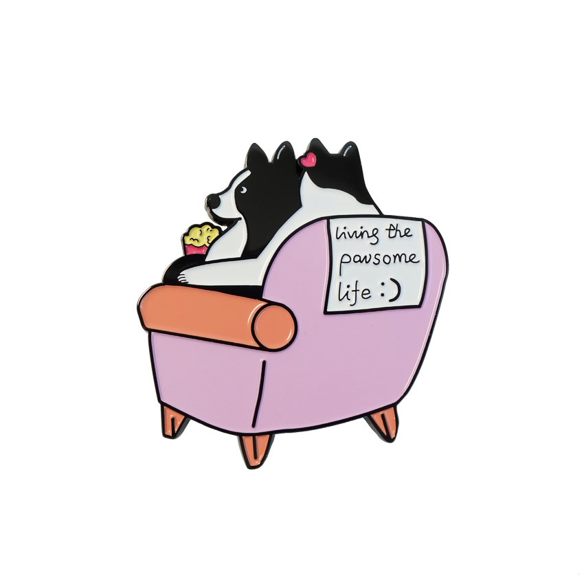 "Live the pawsome life :)" This pin captures the cozy and joyful moment of two furry friends sharing popcorn on a comfy couch. It’s the perfect way to bring a smile to your face and add some warmth to your collection, or gift it to someone who enjoys the simple pleasures of life.