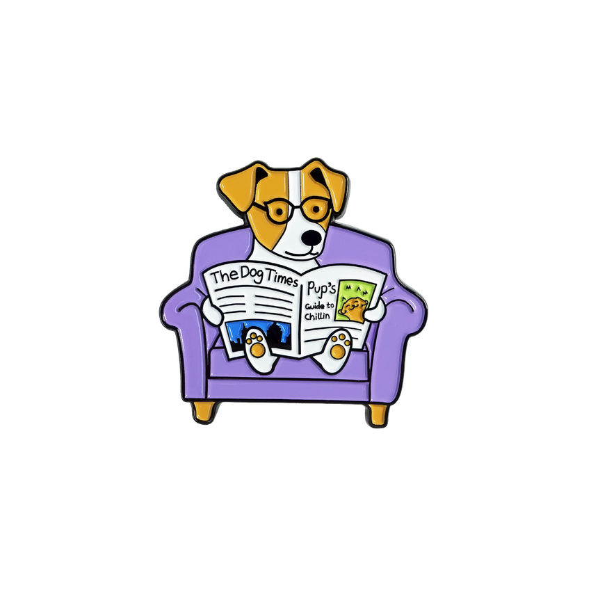 "Chill like a cool pup!" This charming pin features a dog enjoying a leisurely read on a cozy purple armchair, holding a newspaper titled "The Dog Times." It’s the perfect accessory to add a touch of laid-back style to your collection or gift to someone who loves to chill.