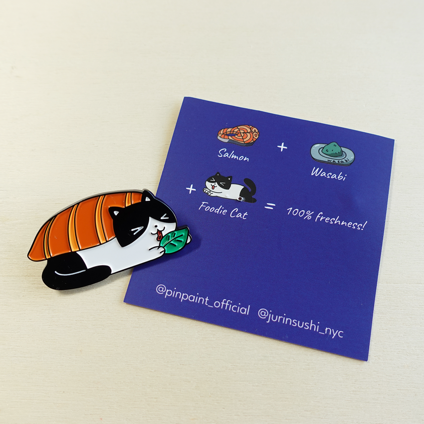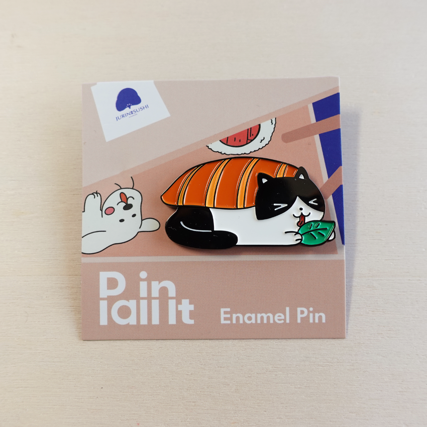Meet Foodie Cat! Wrapped in a salmon sashimi blanket, this playful enamel pin is a 100% fresh collaboration with Jurin Sushi. A must-have for sushi fans and pin lovers!